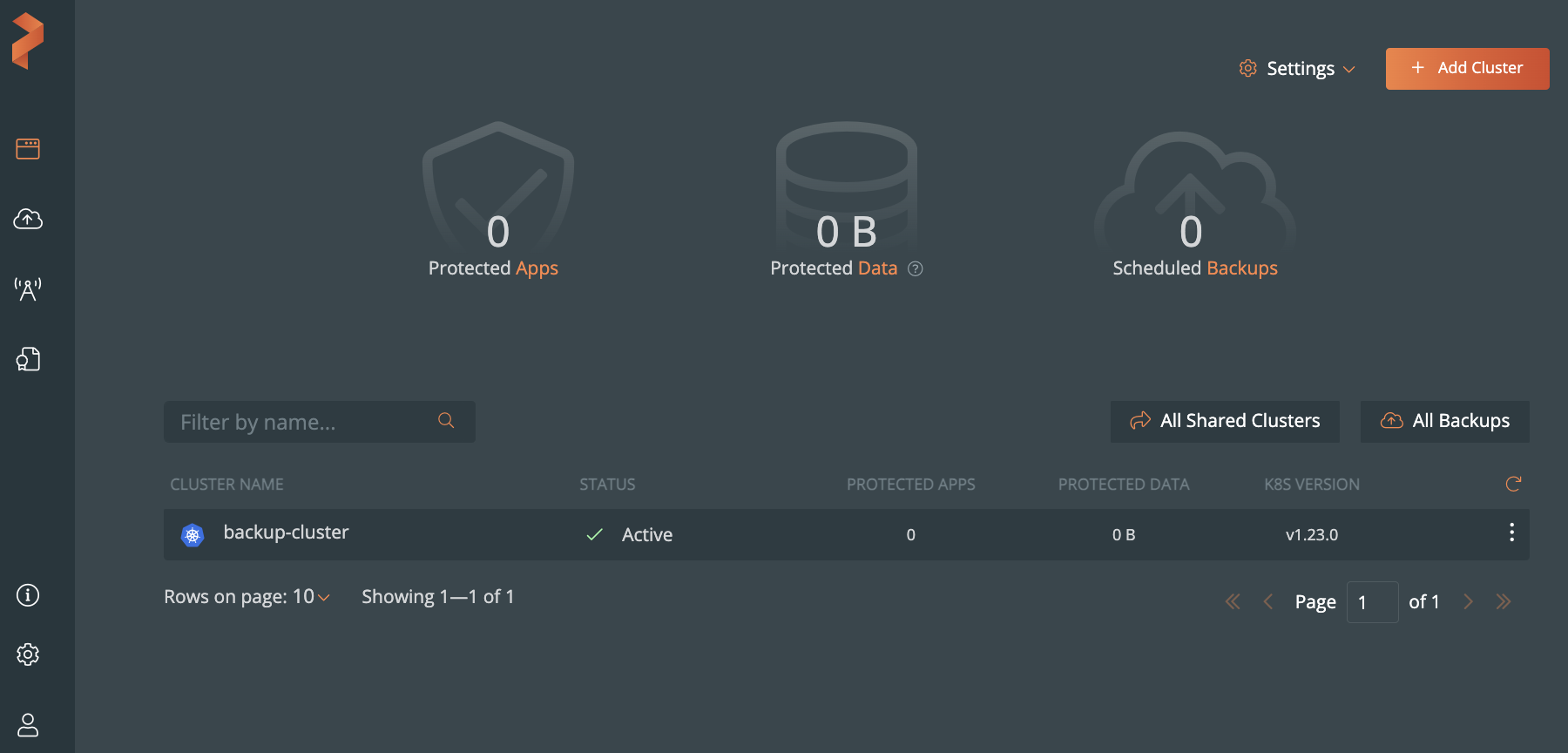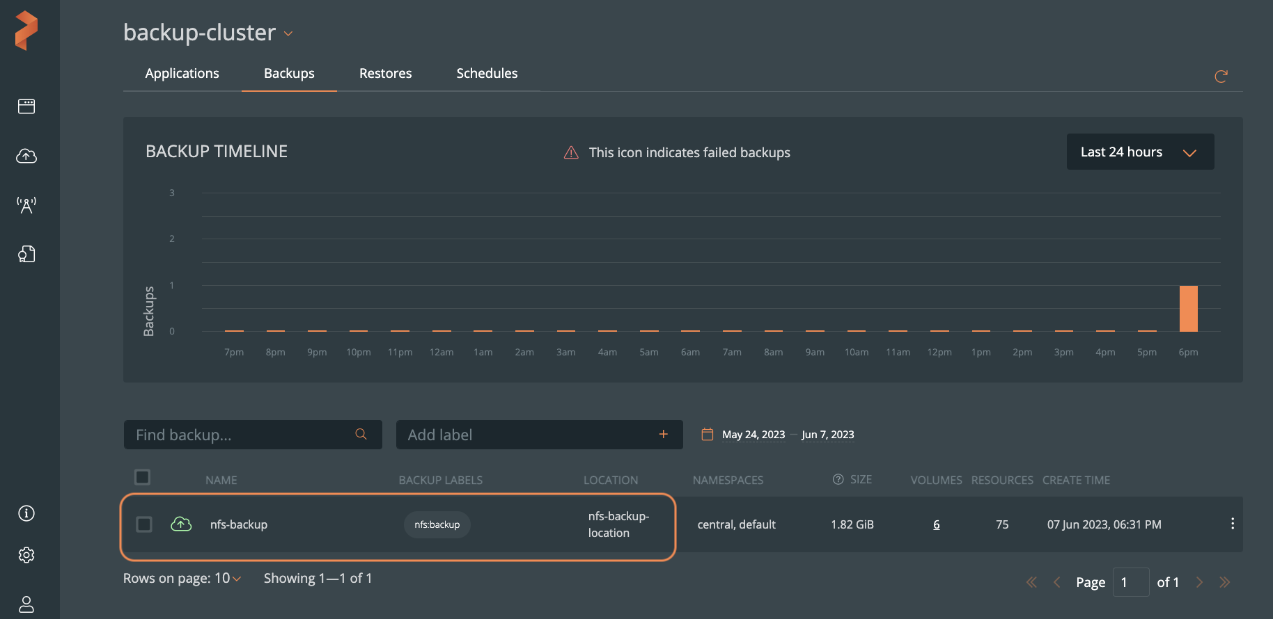 The newly created backup appears in the Backups tab of the application cluster page. For more information on creating a backup, refer to Create a Backup.