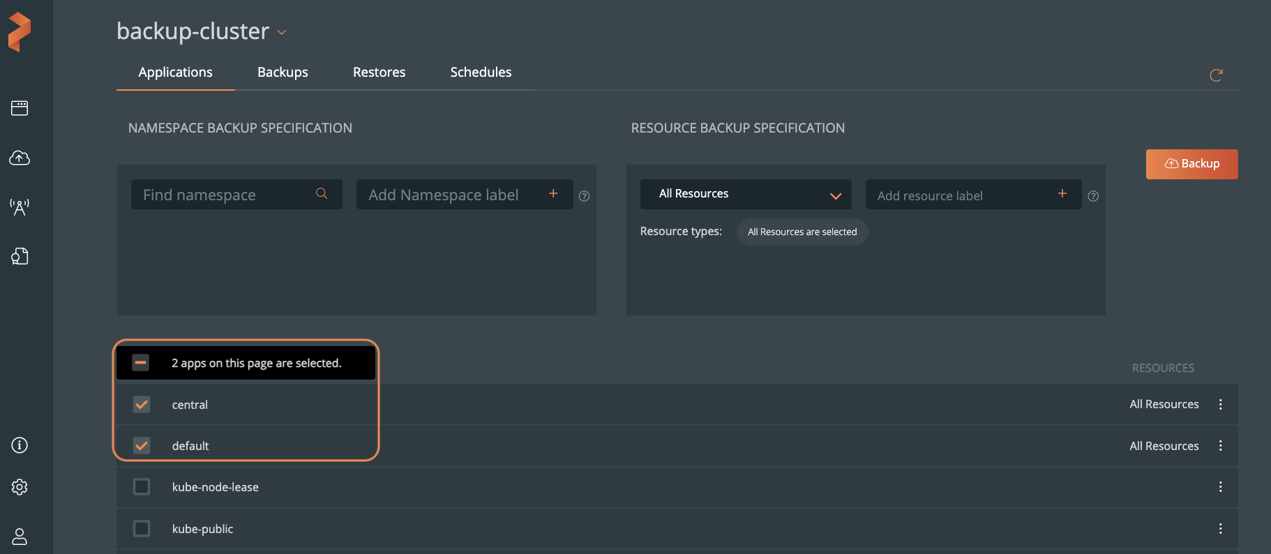 In the application cluster’s Applications tab, select the application(s) you want to back up and then click Backup: