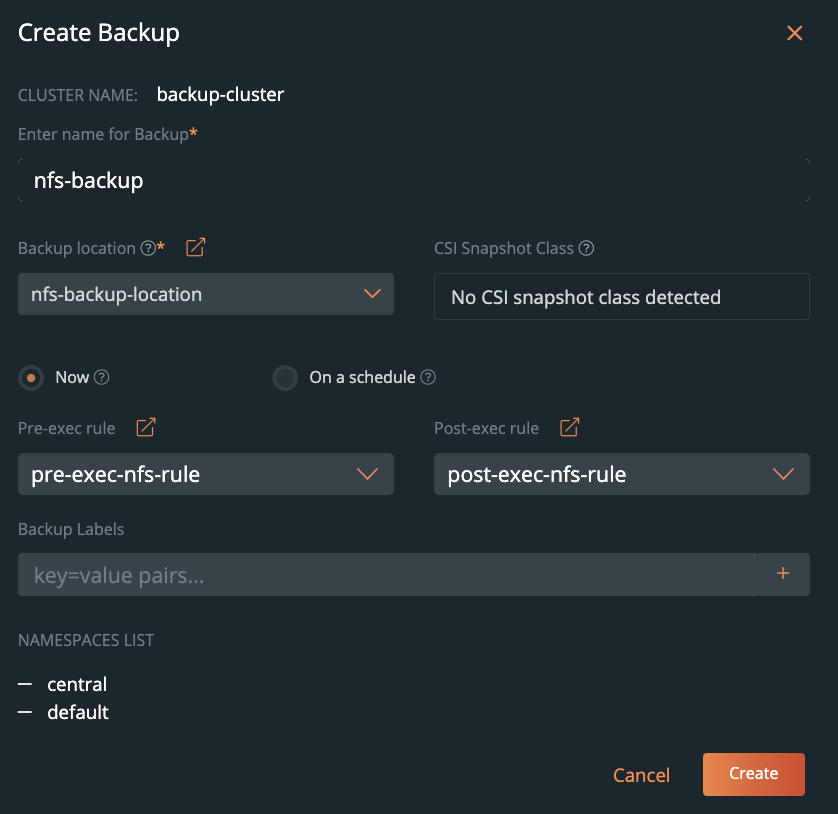 Ensure you choose the NFS share based backup location from the Backup location drop-down and click Create.