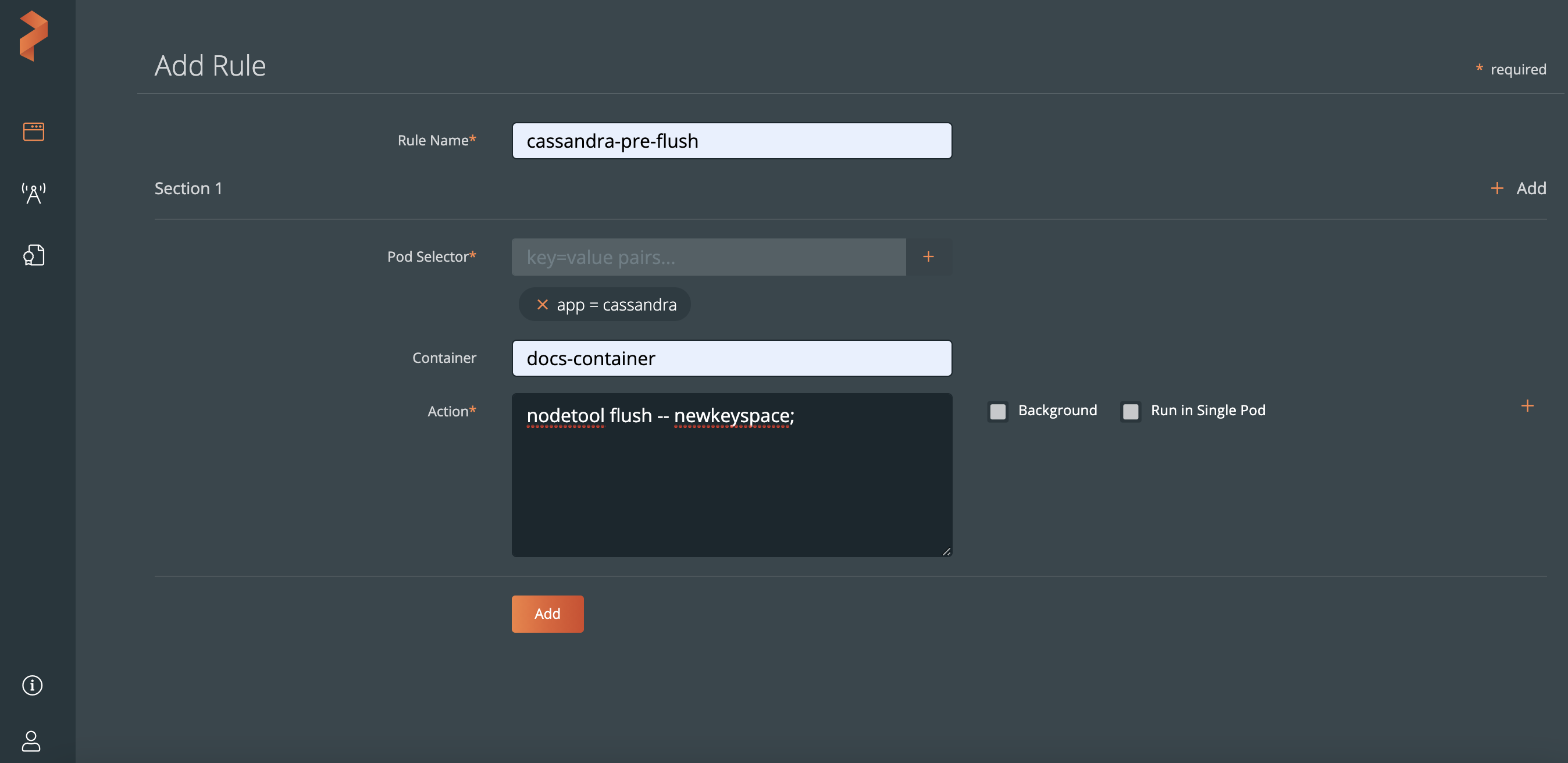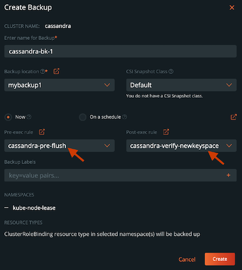 Portworx Backup allows you to set up pre and post backup rules that are applied before and or after a backup occurs. For Cassandra, you can create a custom flush, compaction, or verify rule to ensure a healthy and consistent dataset before and after a backup occurs. Rules can run on one or all pods associated with Cassandra, which is a requirement for nodetool