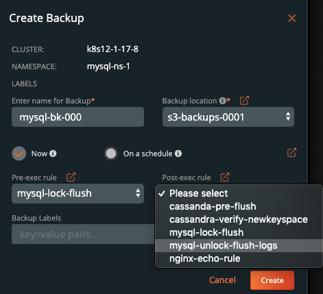 which works well for taking backups specific to MySQL. Since Portworx Backup can provide abstracted backup and restore for a polyglot of data services, we can replicate the best practices of mysqldump, such as flushing and locking logs and tables using Portworx Backup’s pre and post backup rules. Backups and rules can be used across multiple instances of MySQL and multiple types of clouds. This will ultimately simplify operations for devops teams for single or multi-cloud workflows.