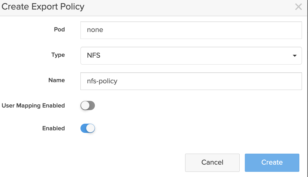 a. From the home page, navigate to Storage > Policies.b. Click + icon to create new export policy: