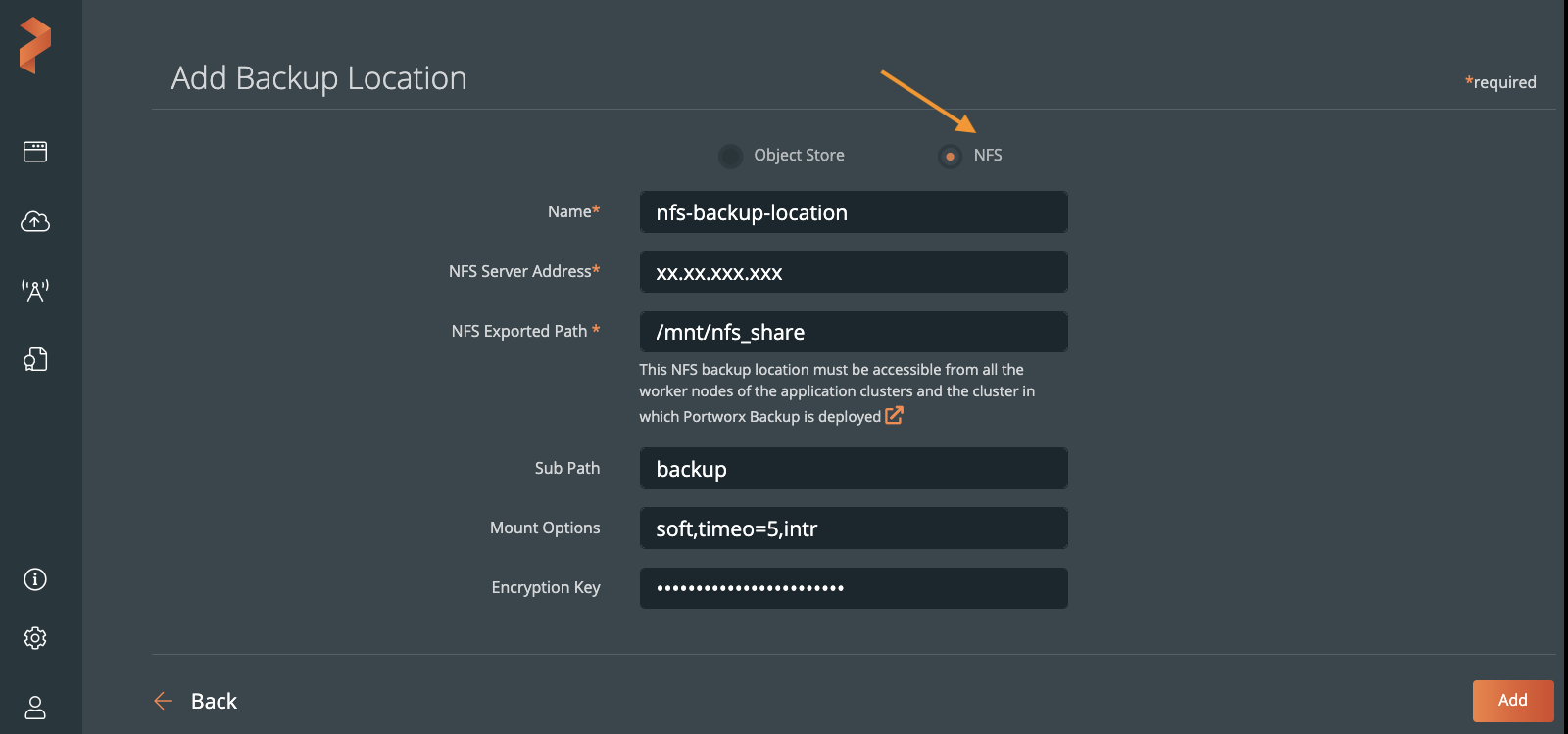 To add a FA NFS file system as backup location through Portworx Backup web console: