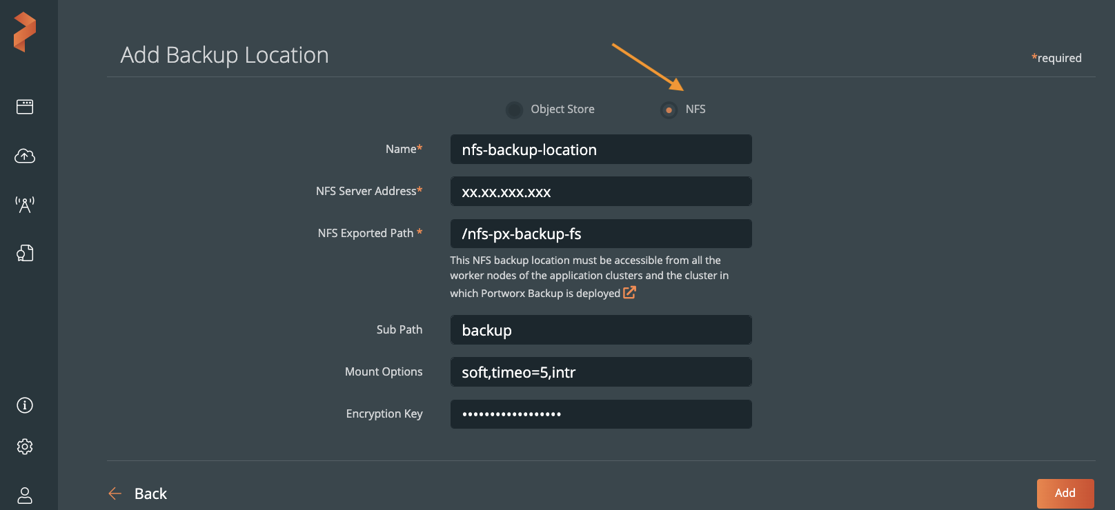 Portworx Backups adds the NFS backup location of the File System you created through FB web console.