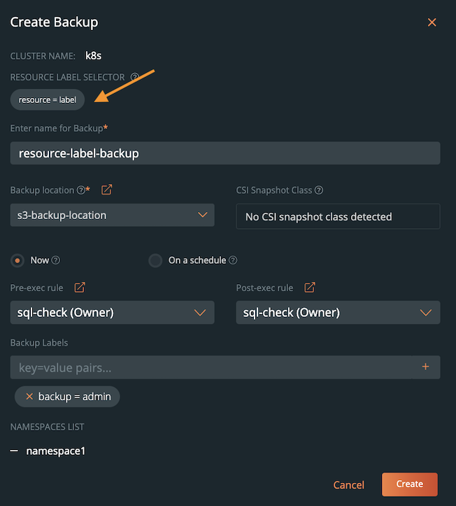 noteThe label used to filter appears under the RESOURCE LABEL SELECTOR field of Create Backup window.