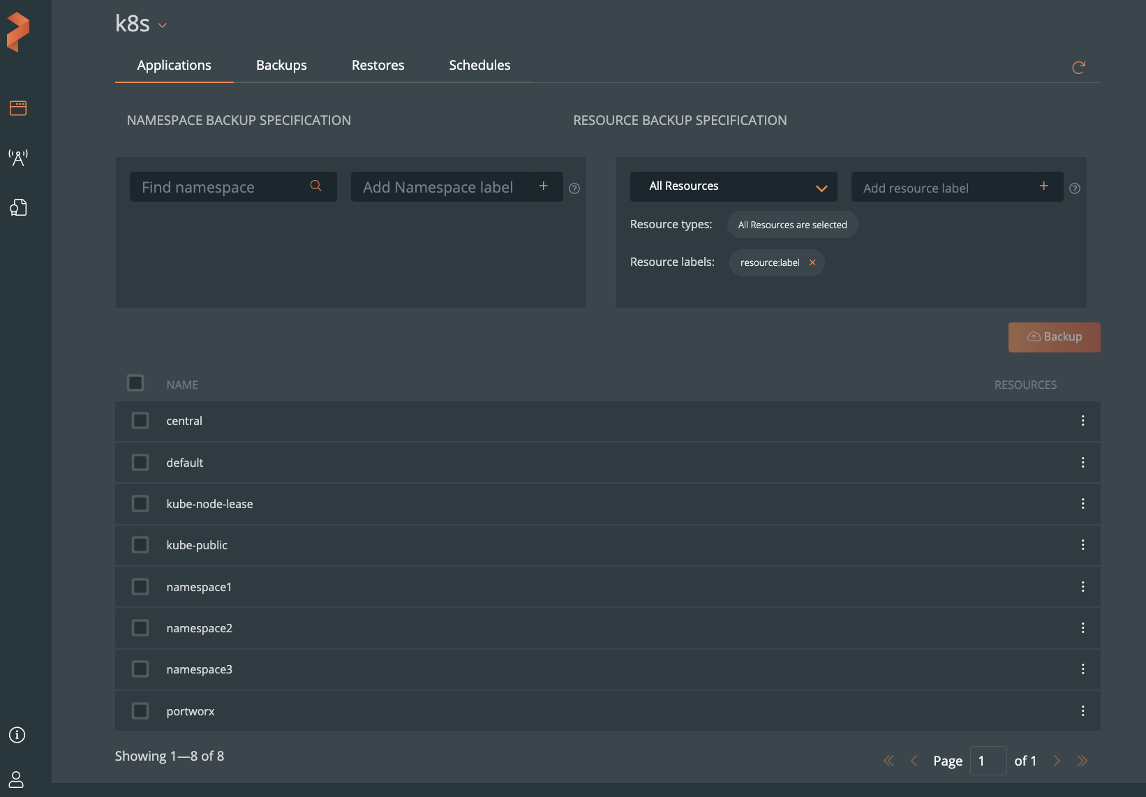 format using the CLI. Portworx Backup UI enables you to filter those labeled resources with the label and then take a backup of all such resources of the selected namespace.