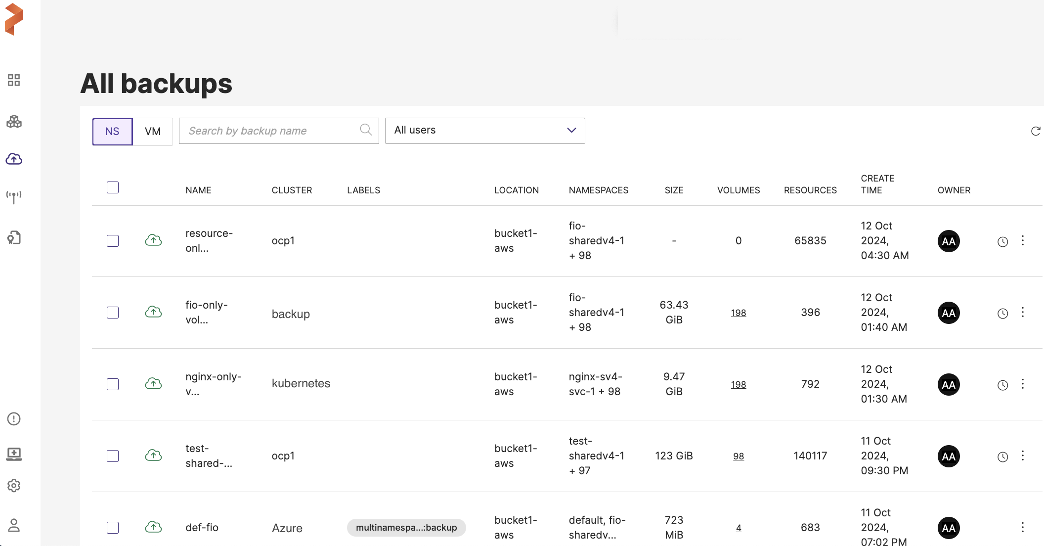 • NS (Namespace): displays namespace-based backups. Namespaces in Kubernetes are logical separations within the cluster, and this view allows users to manage backups of entire namespaces.
