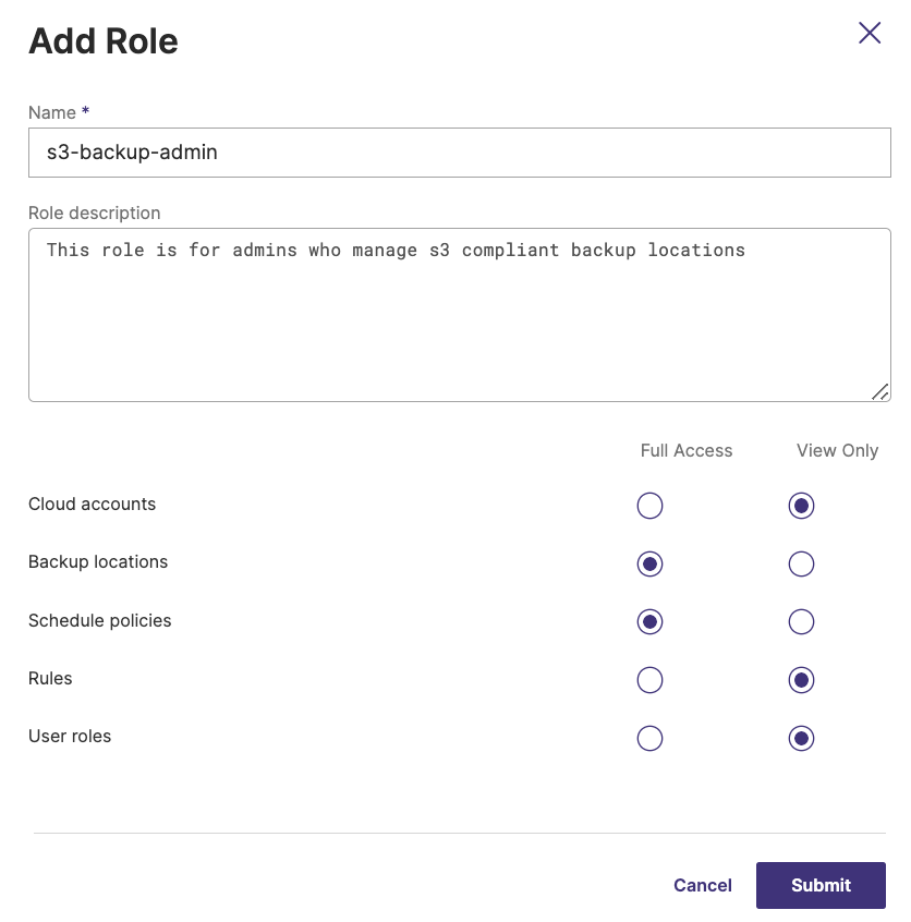 Role description: enter a brief description about the role and available permissions to access Portworx Backup resources.