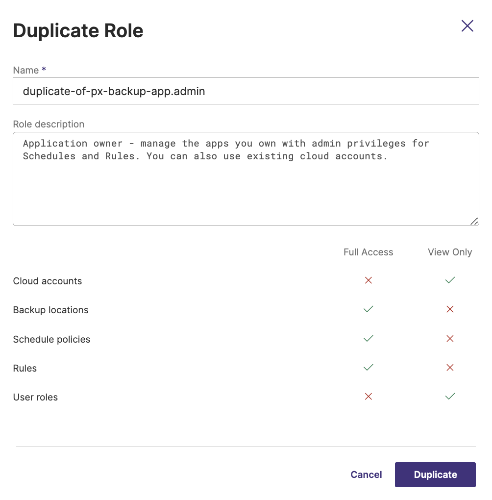 Portworx Backup allows you to duplicate an existing role. Duplicating roles saves you time when creating multiple roles with similar permissions.