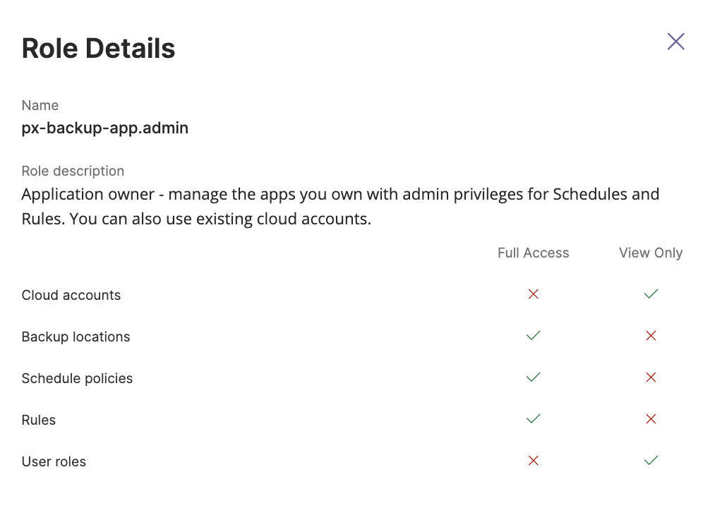 You can add a role with default permissions or assign specific permissions to a role to access Portworx Backup resources. By default, Portworx Backup displays the following pre-created rules: