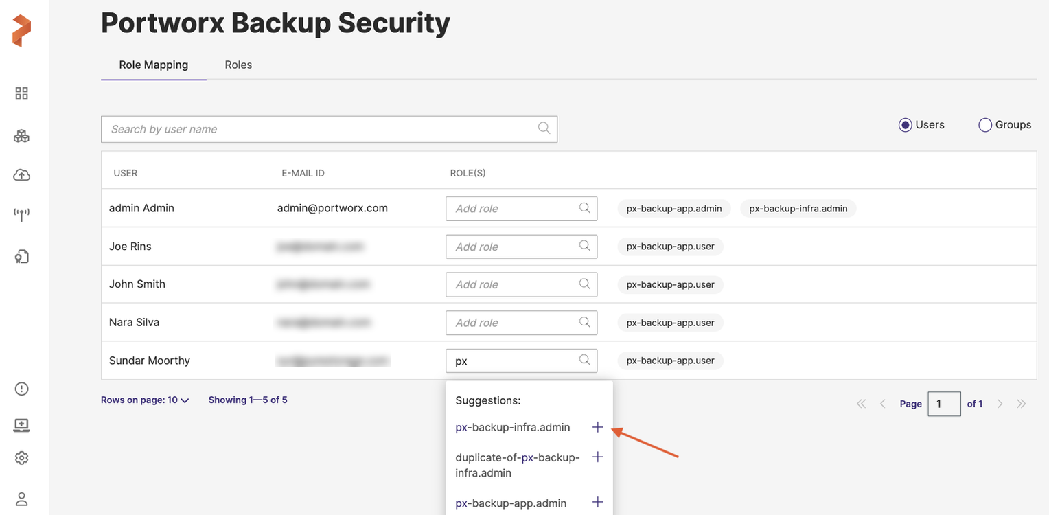 From the bottom bar of the left navigation pane, navigate to User Profile > PX-Backup Security.