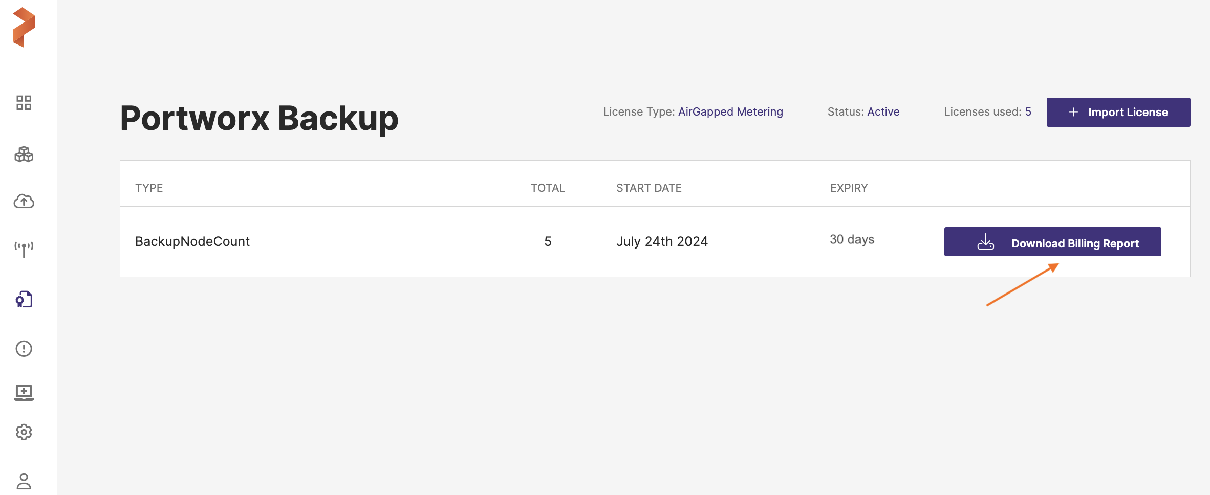 Portworx Backup allows its users on air-gapped cluster environments to opt for usage-based licenses so that they pay only for the backup nodes that are in use and for the number of node-hours they utilize. Users can activate usage-based licensing by activating air-gapped metering license. Also, for such environments, Portworx Backup web console provides an option to download a billing report. The users should share the report with the Portworx Support/CSM team for billing purposes.