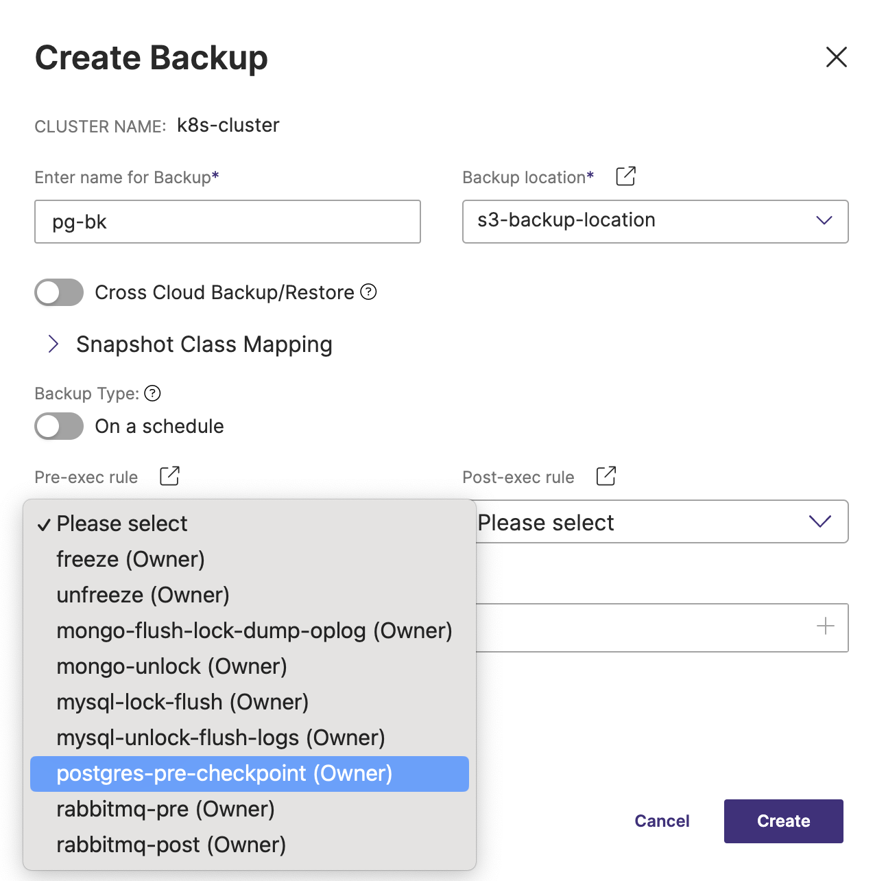 During the backup creation process, select the rules in the pre-exec and post-exec drop-down lists: