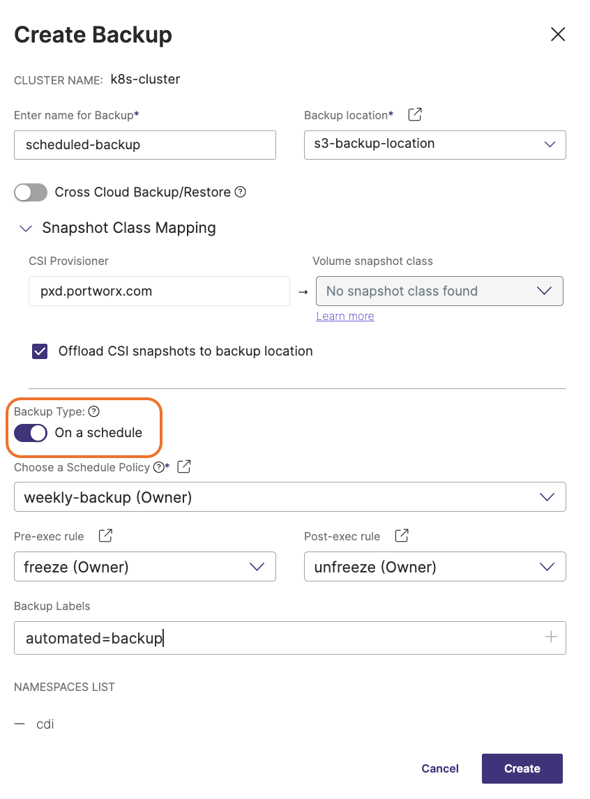 For more information on Portworx Backup's behavior for the various supported combinations of CSI Provisioner, Volume snapshot class, and Offload CSI snapshots to backup location, refer to Backup types matrix.