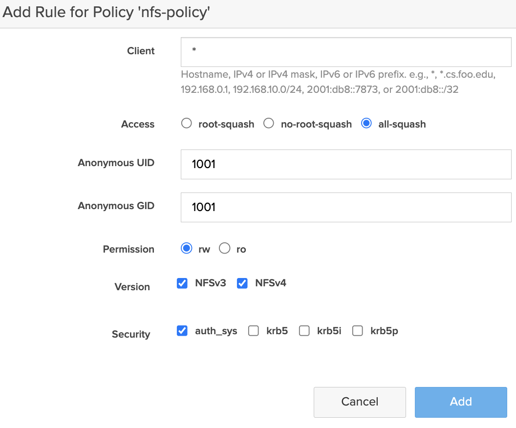 if you do not want to restrict any of the clients to access the NFS shares, otherwise enter the IP address(s) of the clients if you want to allow only a single or set of clients (application clusters) to access the NFS shares -