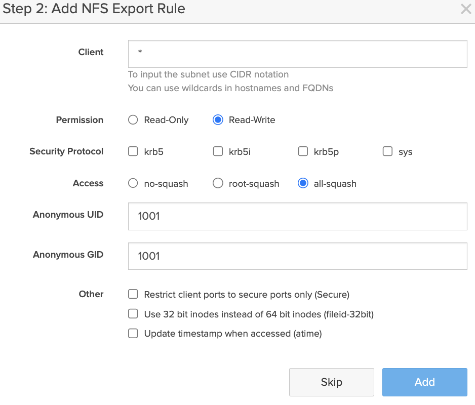if you do not want to restrict any of the clients to access the NFS shares, otherwise enter the IP address(s) of the clients if you want to allow only a single or set of clients (application clusters) to access the NFS shares -