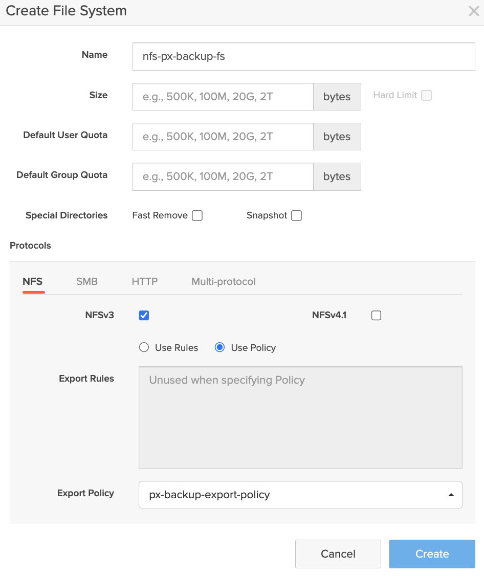 Portworx Backup allows you to add NFS File systems created with FlashBlade (FB) web console as backup location. FB file system is a service activated on FlashBlade, offering the capability to establish an NFS file system using the backend block storage.