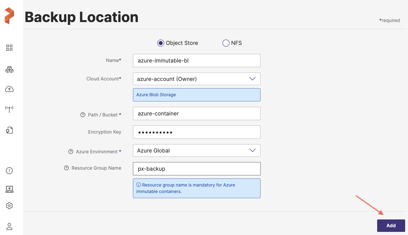 Immutability support helps to protect data from overwrites and deletes. Starting from Portworx Backup version 2.7.3, you can add your containers (that support immutability) as a backup location through the Portworx Backup web console. You will need new Azure credentials and configurations to add immutable Azure backup locations.