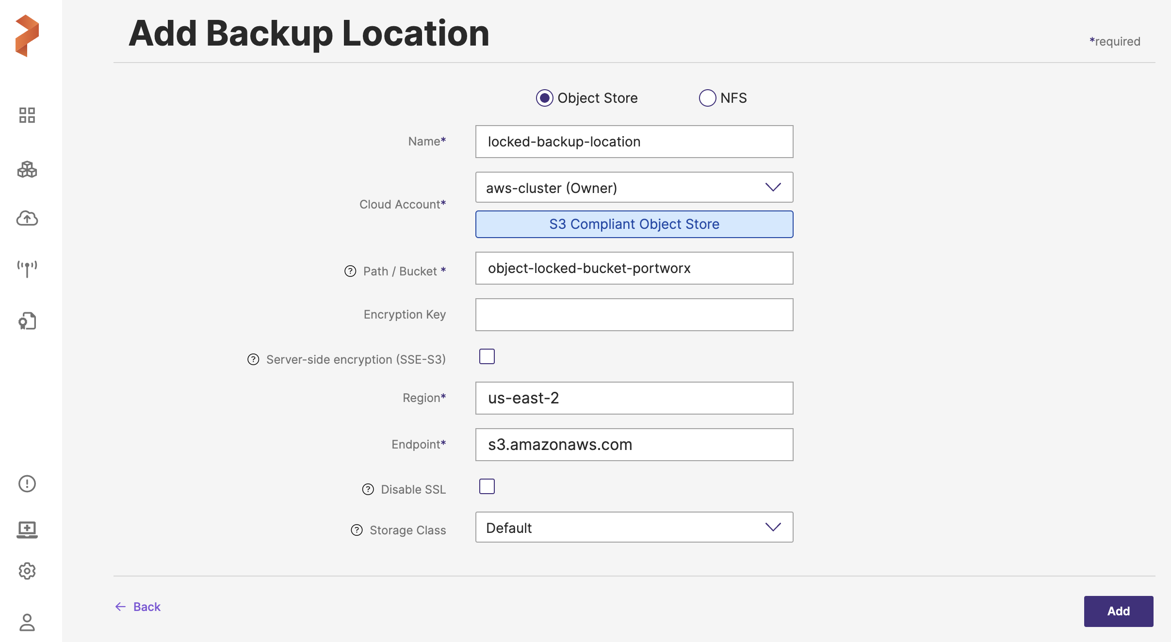 Portworx Backup creates an object lock enabled backup location with a lock icon and this will be visible under Settings > Cloud Settings > Backup Locations.