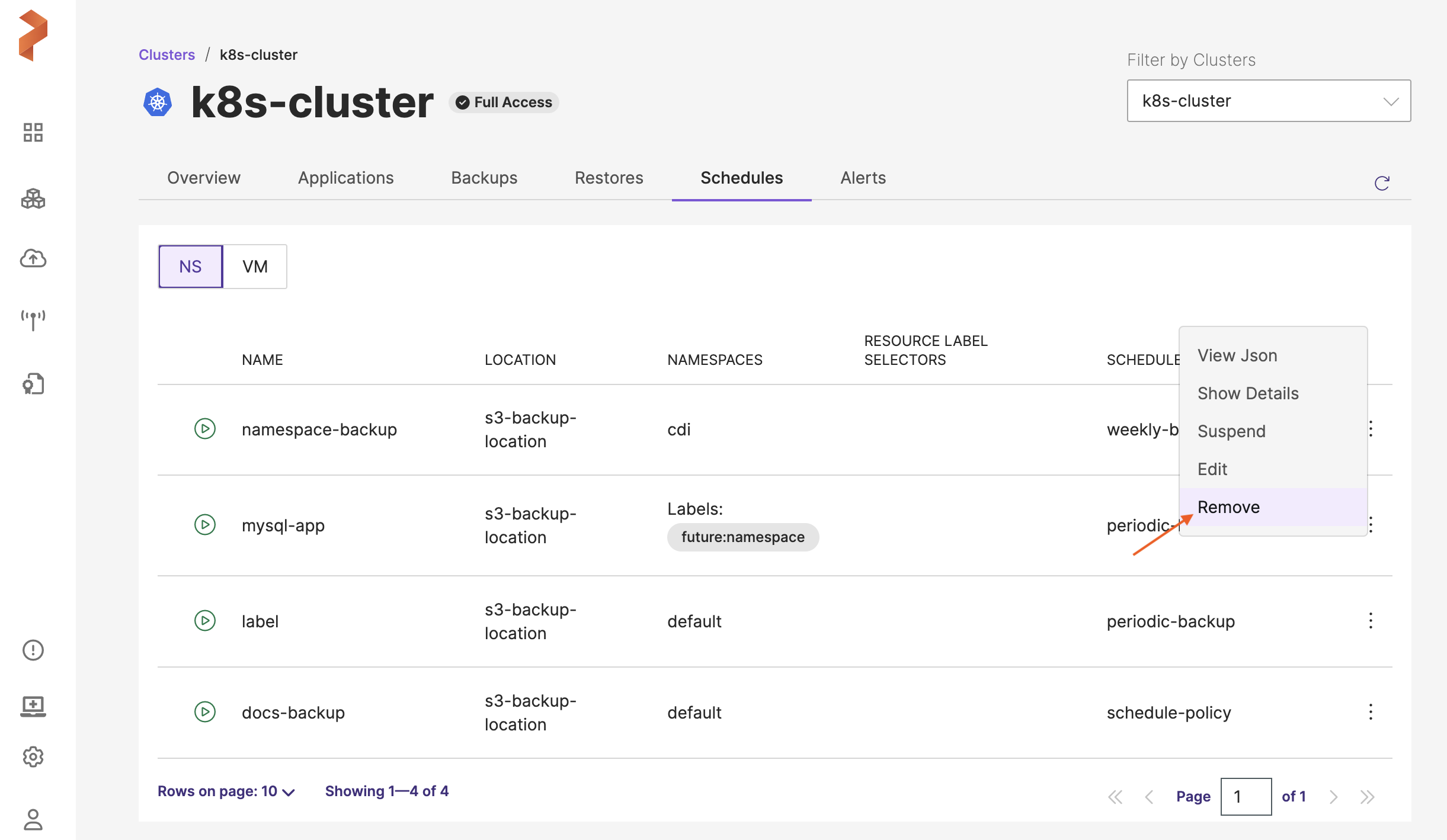 2. In the cluster page, go to the Schedules tab and then go to NS.