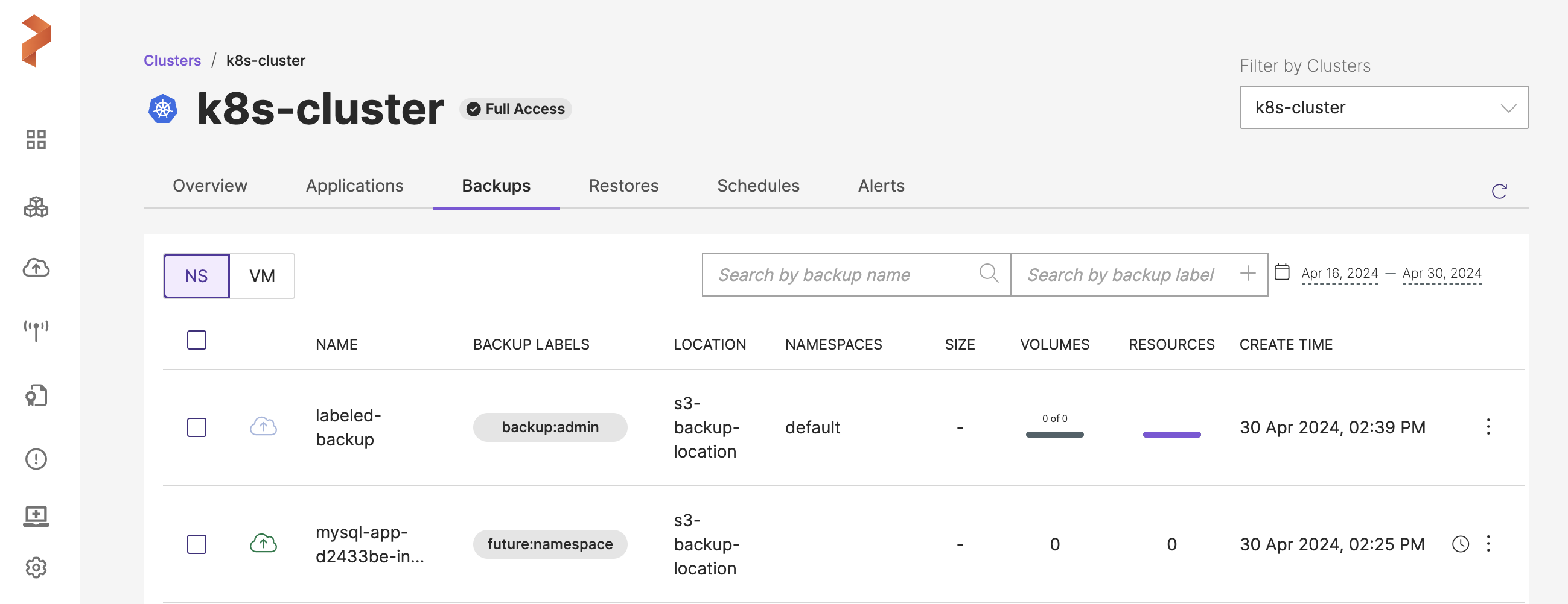 4. Under NS tab, select the required namespace (or application) and then click Backup.