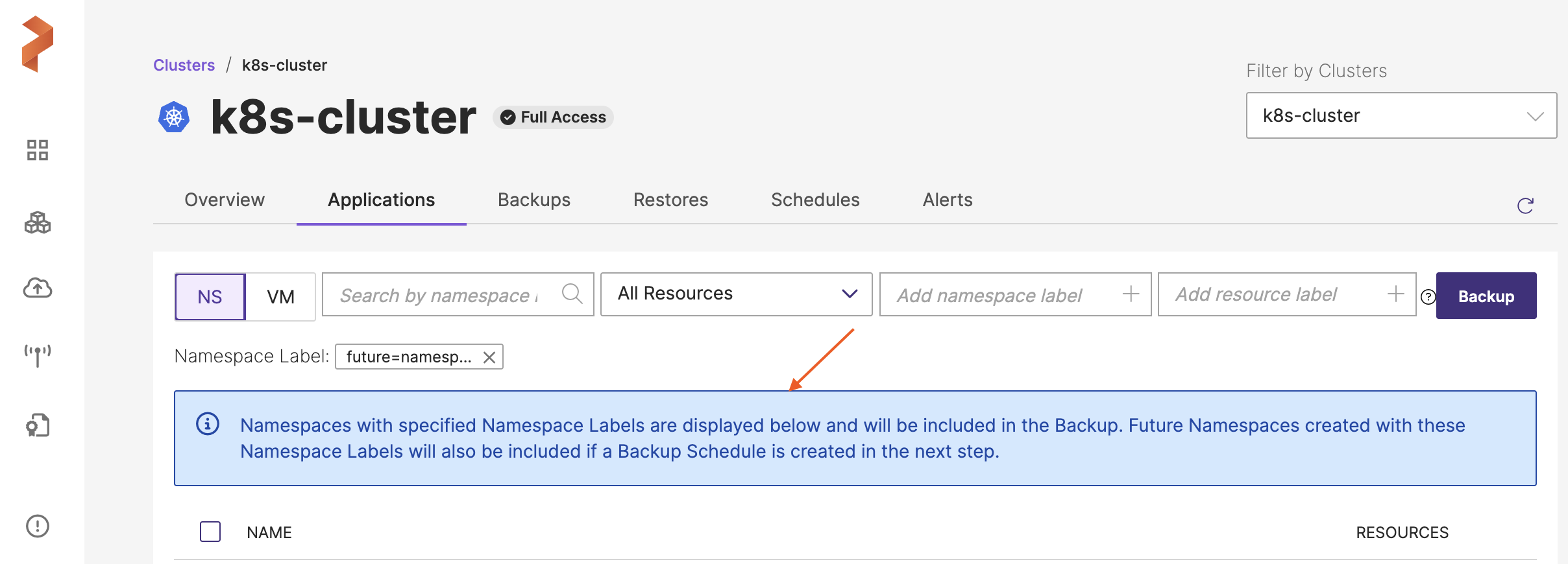 In the Search by backup label field, provide the required namespace label(s) that you applied through the CLI and then press Enter.