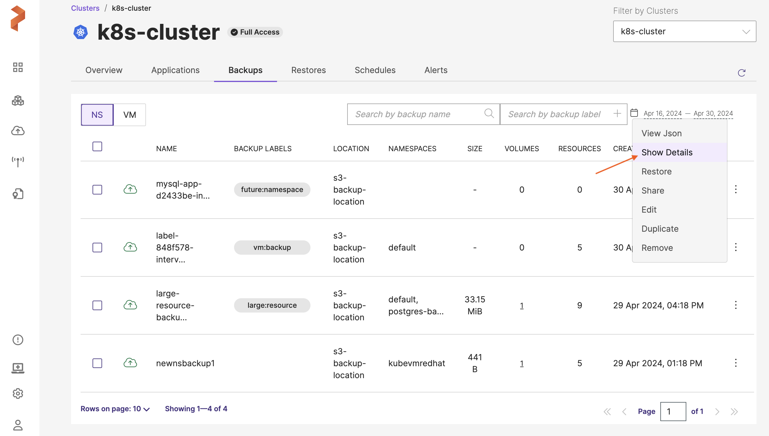 After the backup is created, navigate to the Backups tab of the application cluster, click on the vertical ellipsis of newly created scheduled backup and choose Show details to view the backup details: