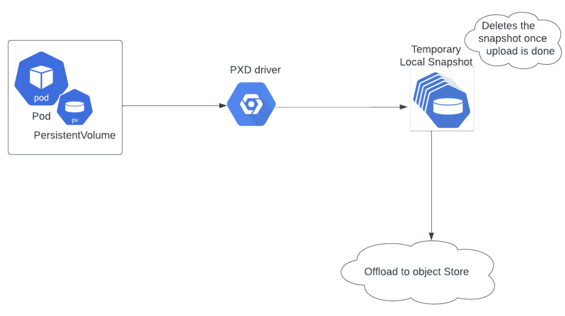 In Portworx Backup, CSI driver takes local snapshots and later offloads or uploads those snapshots to S3 compliant object store or NFS-based backup locations using KDMP driver.