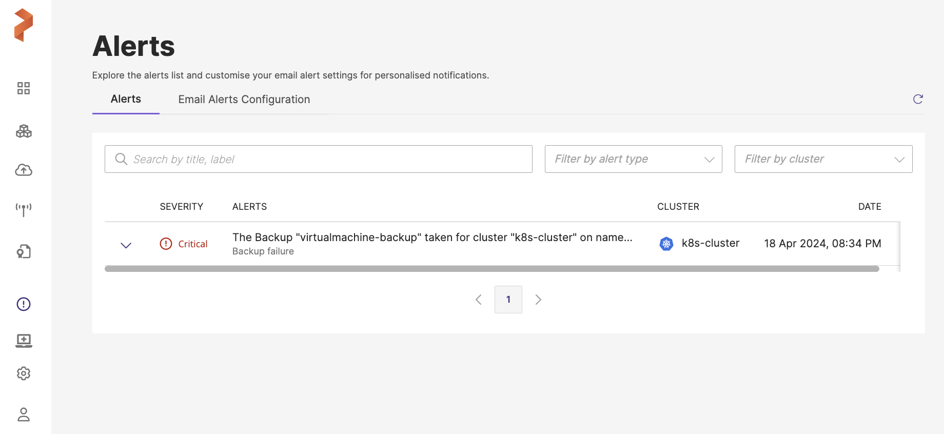 To access Alerts, click Alerts icon in the left navigation pane of Portworx Backup home page. Alerts page contains two tabs: