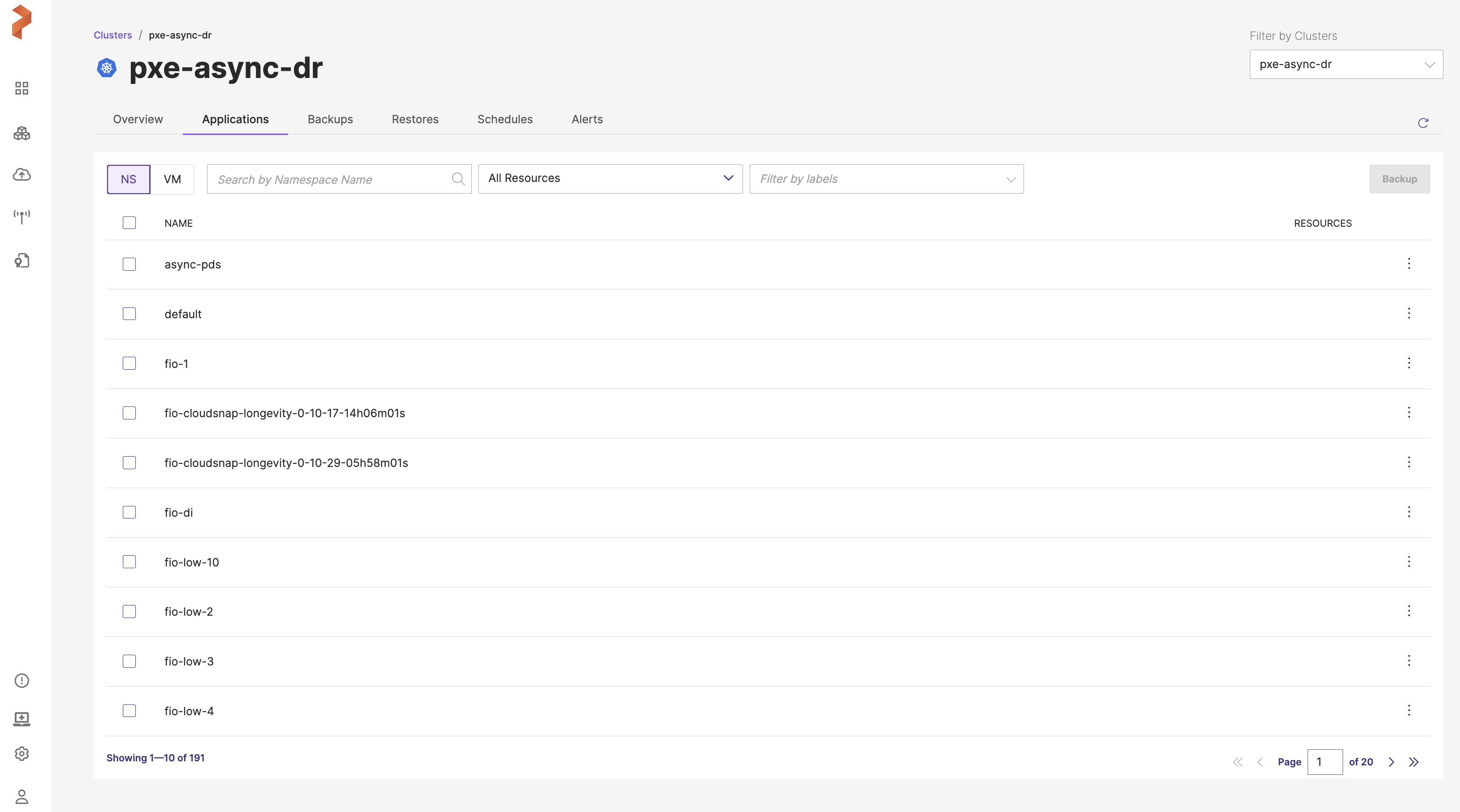 The Applications tab displays the list of Kubernetes Namespaces (NS) and Virtual Machines (VM) for the selected cluster. Users can browse, filter, and select namespaces or Virtual machines to initiate backups.