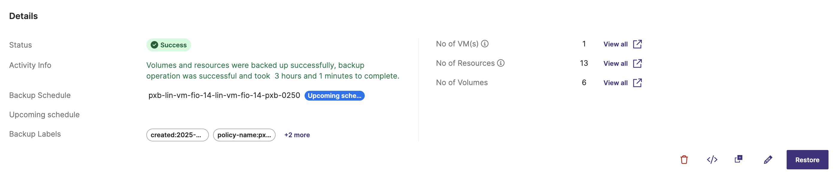 Details: an expandable arrow to give more information on the backup such as status, activity information, backup schedules, upcoming schedules, retention period information, number of namespaces/VMs, resources, and volumes backed up in namespace or VM backup. You can click View All to view all the namespaces/VMs, resources and volumes associated with the backup. Besides, it gives options to delete, view Json, duplicate, edit and restore the backup.