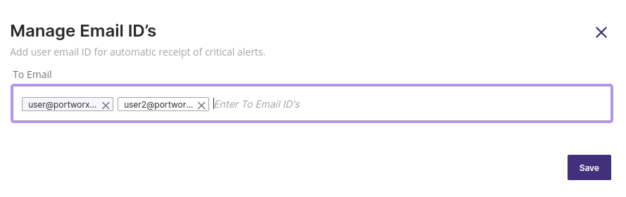 In the Manage Email ID's window, add the required email ID(s) and click Save. If you need to add multiple email IDs separate them with a comma.