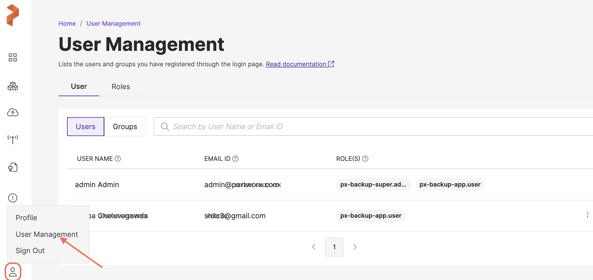 3. Click User Profile icon at the bottom and choose Portworx Backup User Management option.