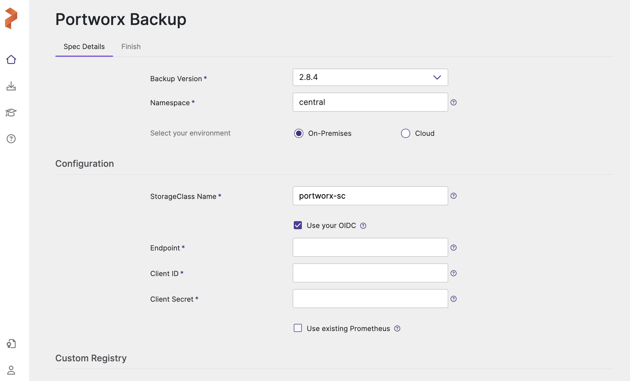 Namespace: provide the name of the namespace where you want an instance of Portworx Backup to be installed
