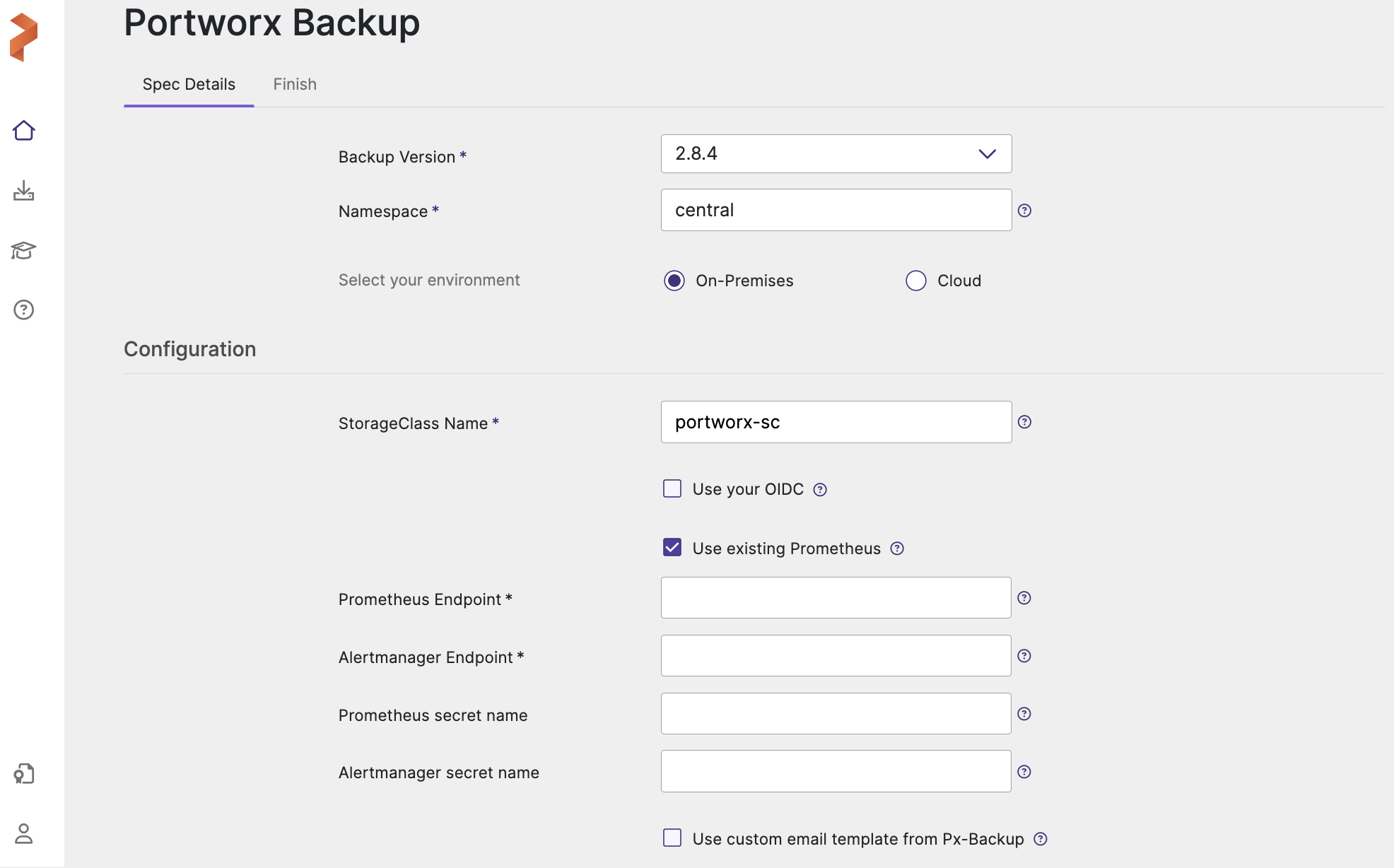 Use existing Prometheus: select this checkbox if you have to use your existing Prometheus stack to monitor Portworx Backup and enter the values for the following fields: