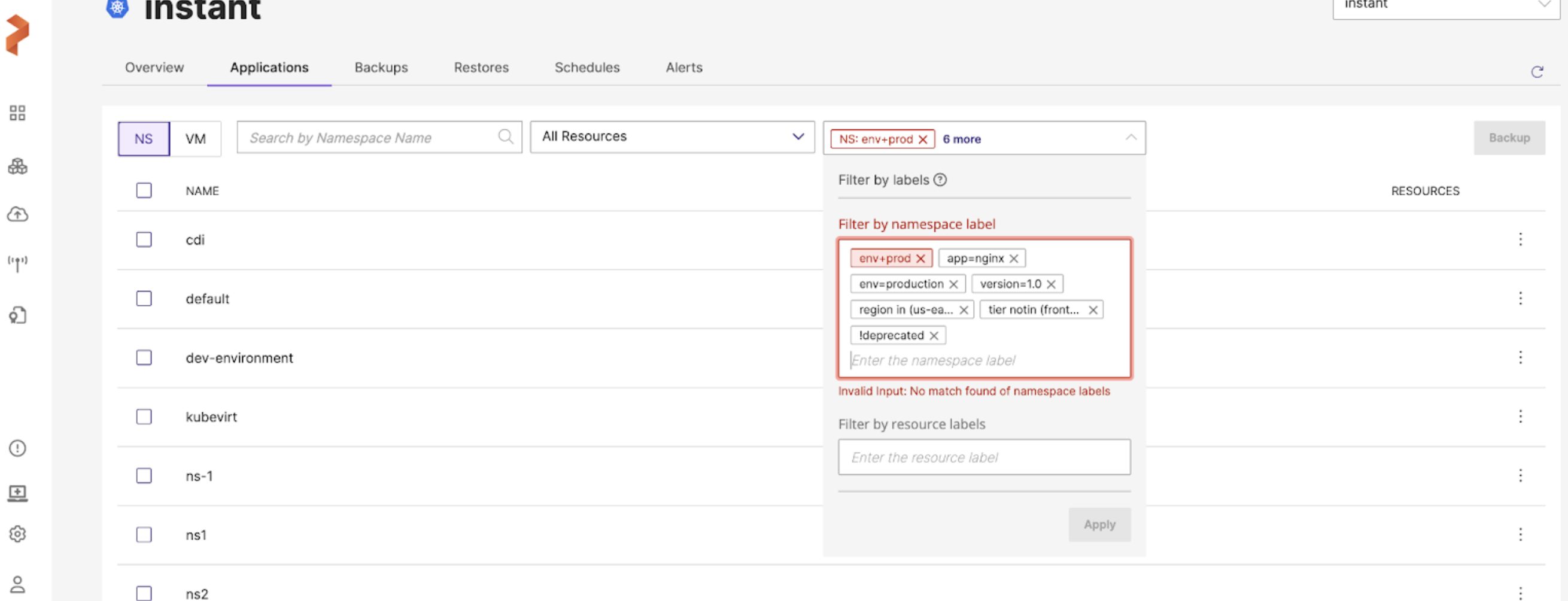 • Stork version must be at least 25.2.1 for advanced filters. If you are on an older version, use the key=value or key:value format to filter namespaces by labels.