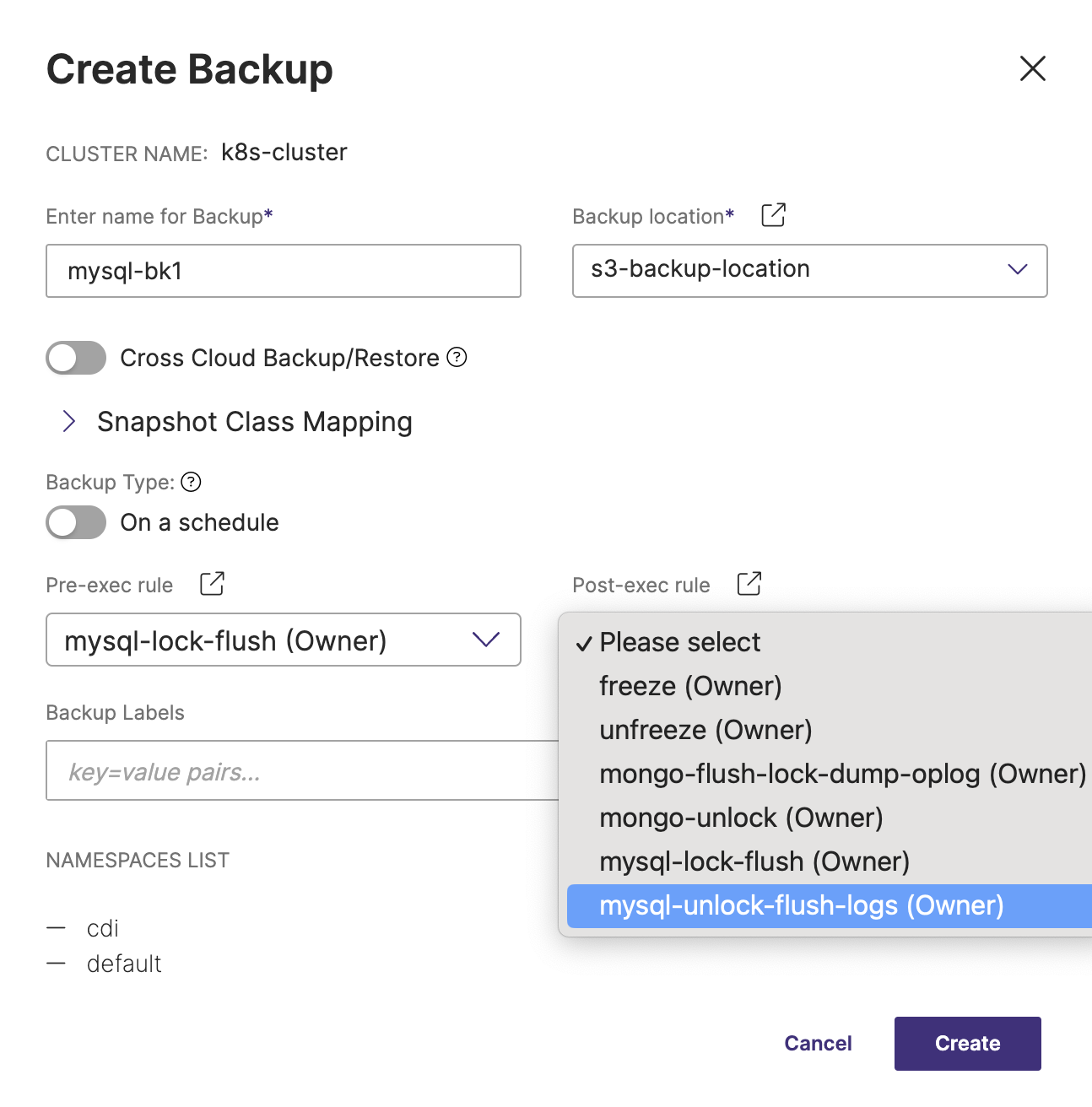 MySQL has a tool called mysqldump which works well for taking backups specific to MySQL. Since Portworx Backup can provide abstracted backup and restore for a polyglot of data services, we can replicate the best practices of mysqldump, such as flushing and locking logs and tables using Portworx Backup’s pre and post backup rules. Backups and rules can be used across multiple instances of MySQL and multiple types of clouds. This will ultimately simplify operations for devops teams for single or multi-cloud workflows.