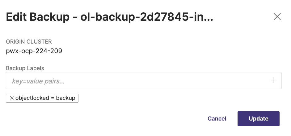 Enter new backup label(s) or delete a pre-applied label and select Update. You can apply multiple labels to your object lock enabled backup to filter them later based on the need.