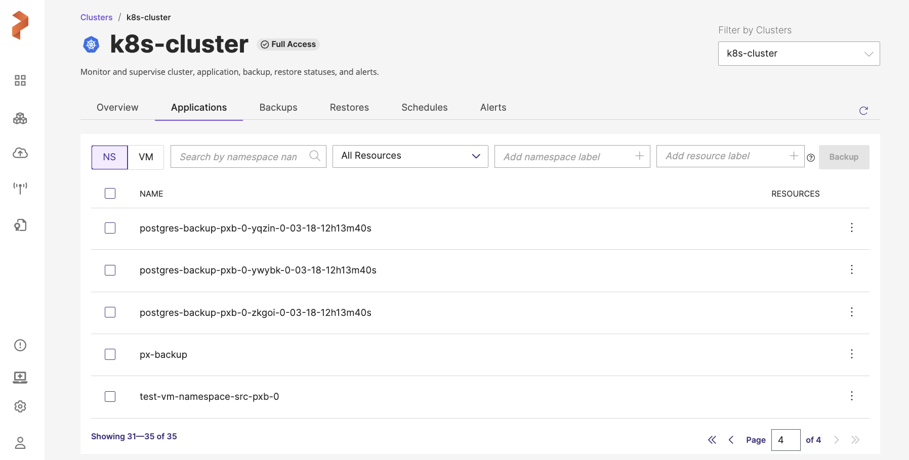 notePortworx Backup allows you to select multiple namespaces of a cluster from different pages and then back up the chosen namespaces in a single click.