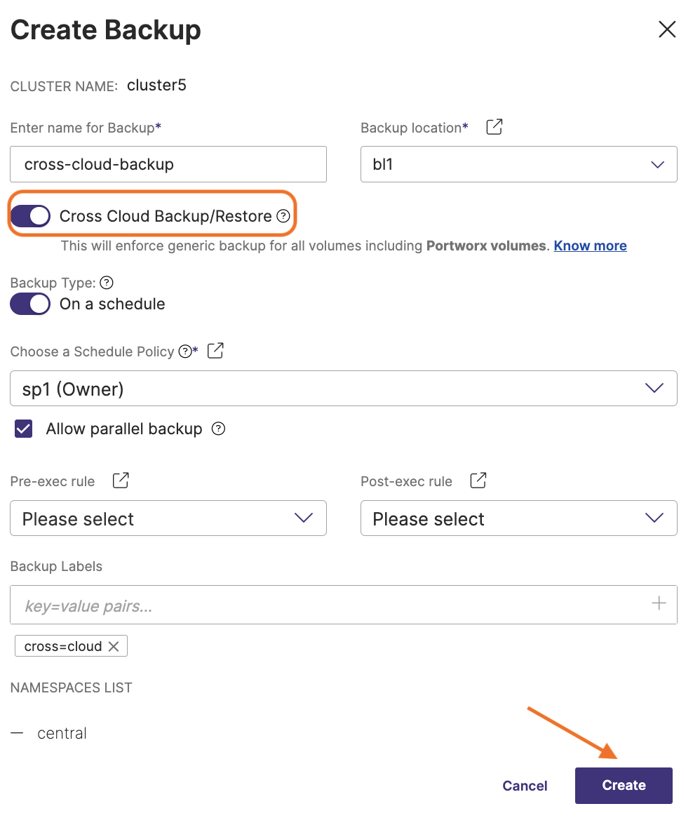 Cross Cloud Backup/Restore: this option is disabled by default. Enable this toggle button if you want to create a backup on a specific cloud environment and want to restore it on another cloud environment. After you enable this option, Portworx Backup triggers a direct KDMP backup and disables Snapshot Class Mapping option.