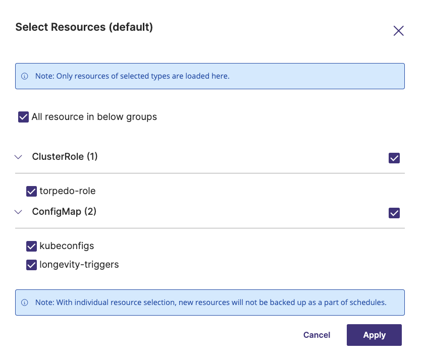 All resources: this drop-down allows you to select the required resources or all the resources along with a search option to traverse the list with the resource name. After selection of resources, you can select individual resources of a resource group by navigating to Vertical ellipsis > Select Resources (gets enabled after you select one or more resources) under Resources column provided at the end of each namespace in the Portworx Backup web console.