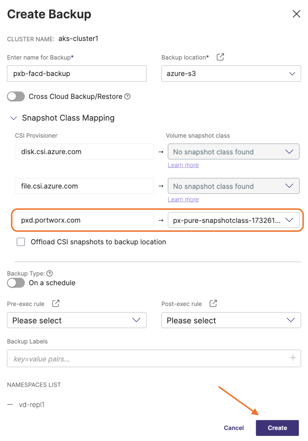 Snapshot Class Mapping: facilitates mapping of your storage provisioner with volume snapshot class