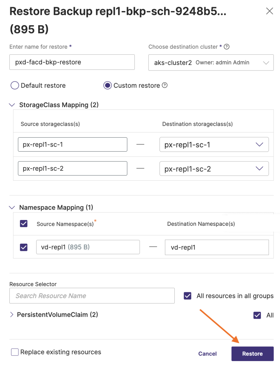 Destination Storageclass(s): Select the storageclass to which you want to restore the backup.