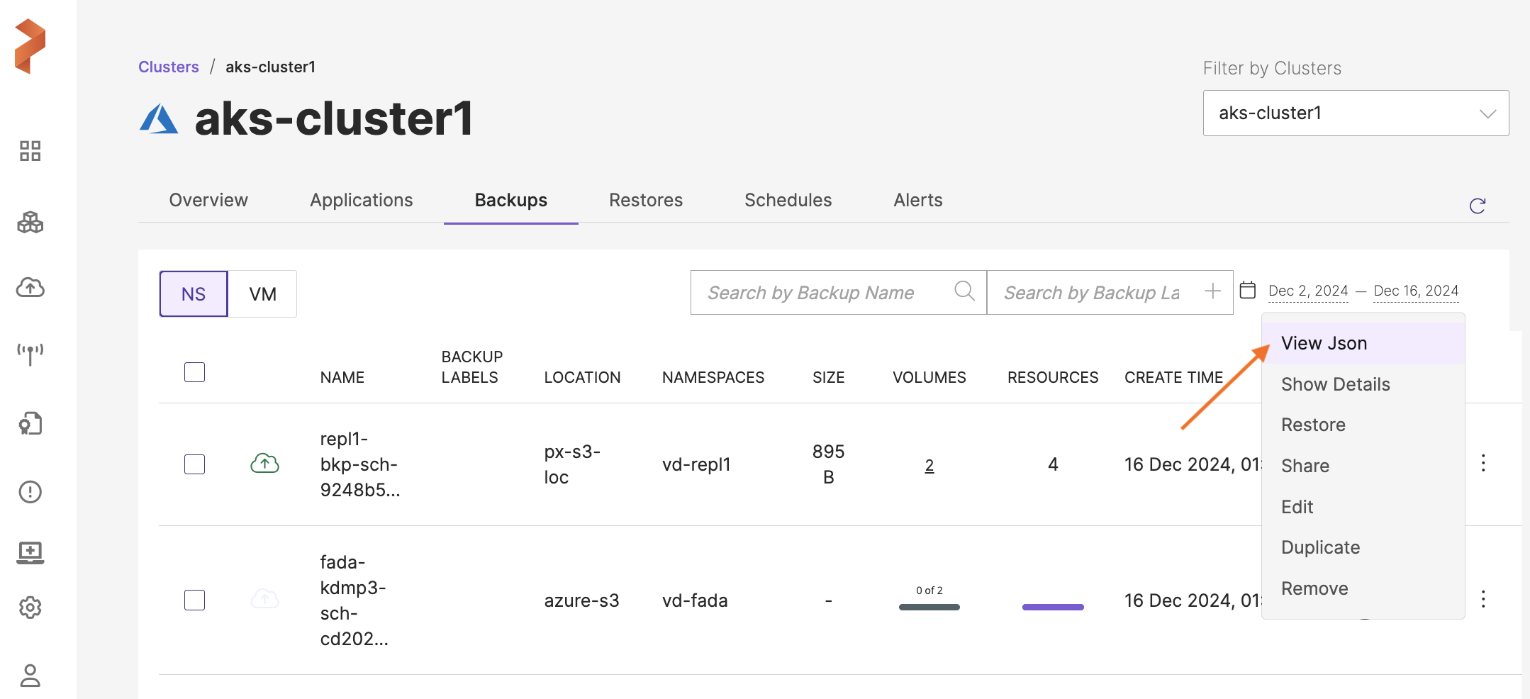 You have now backed up your Portworx volumes on a backup location on FlashArray. To view the backup you have created, from the home page, navigate to Clusters > Backups tab.
