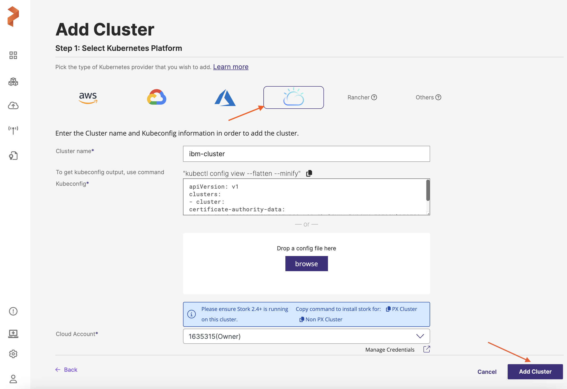 Kubeconfig: retrieve the Kubeconfig from your cluster and paste it here or click Browse to upload it from a file