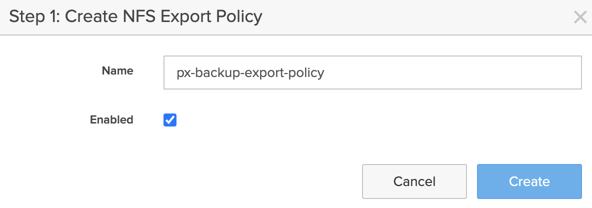 c. In the Create NFS Export Policy window specify policy name of your choice in the Name field and ensure Enabled option is checked and then click Create.