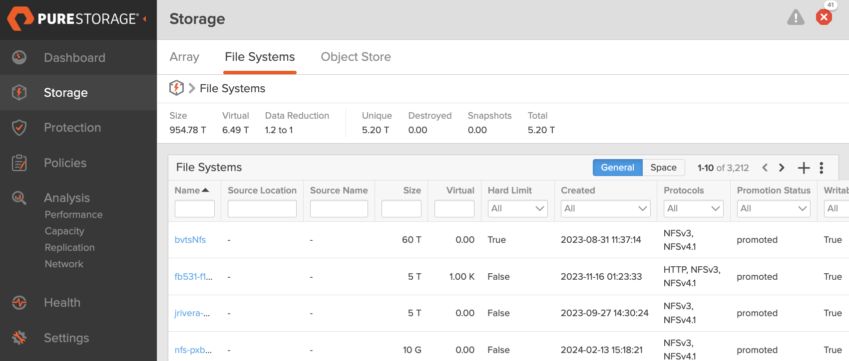 Portworx Backup allows you to add NFS File systems created with FlashBlade (FB) web console as backup location. FB file system is a service activated on FlashBlade, offering the capability to establish an NFS file system using the backend block storage.