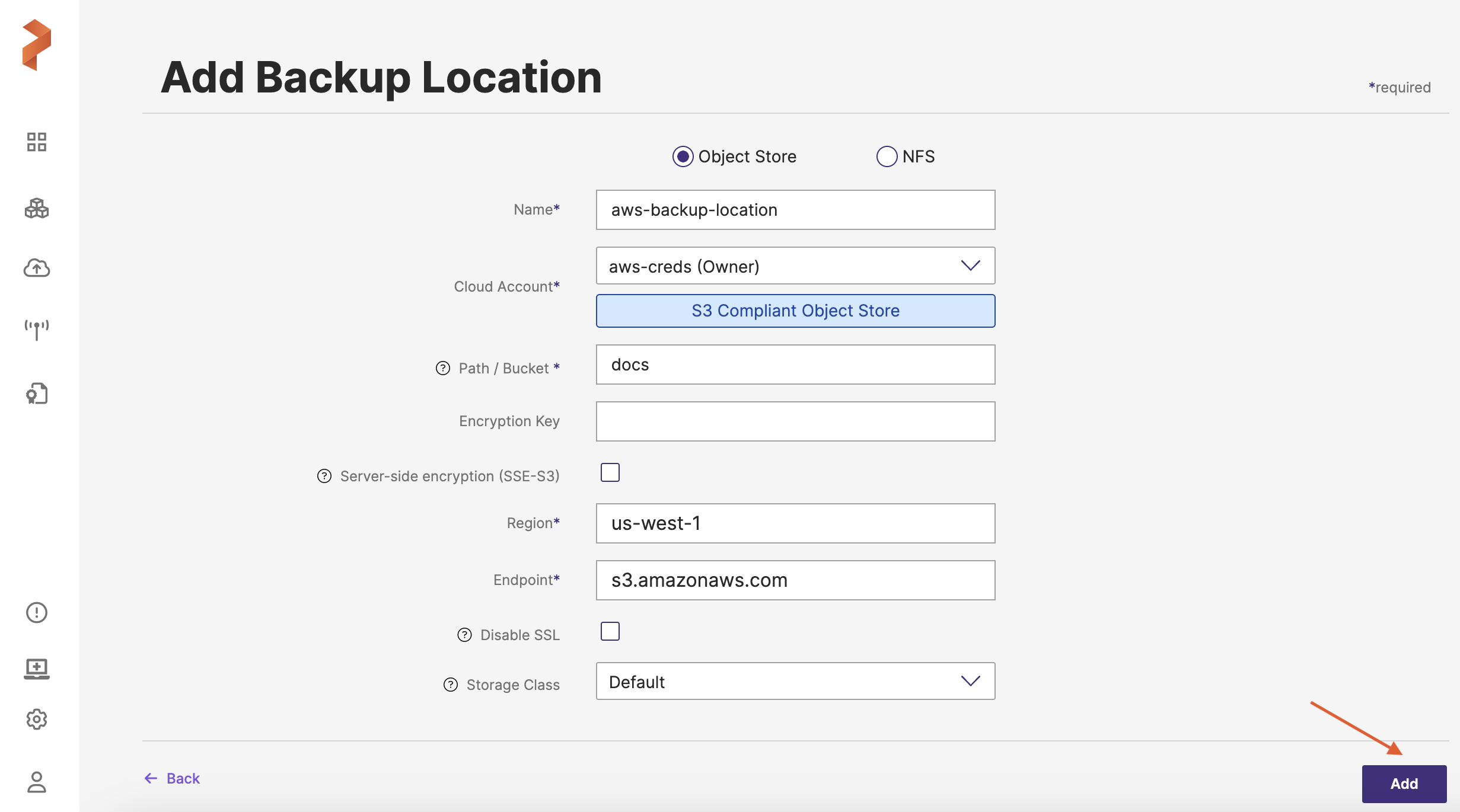 Perform the following steps to add AWS S3 compatible object store as backup location in Portworx Backup: