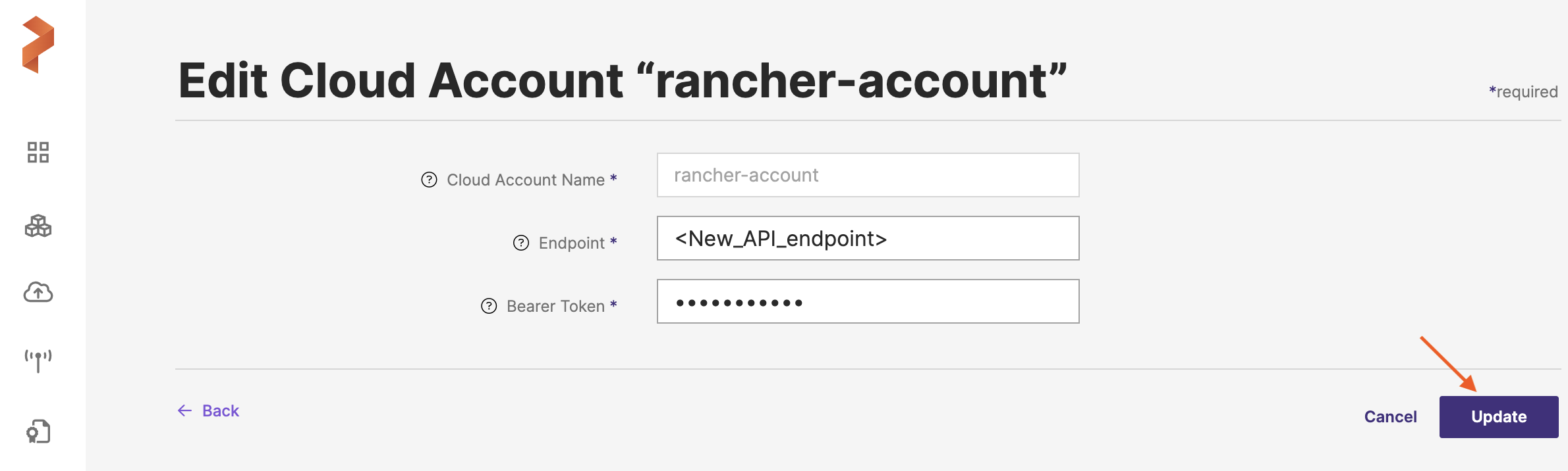You can also edit the Rancher cloud account to update the Endpoint (when there is change in setup) and Bearer Token (if the secret key expires) details when needed:
