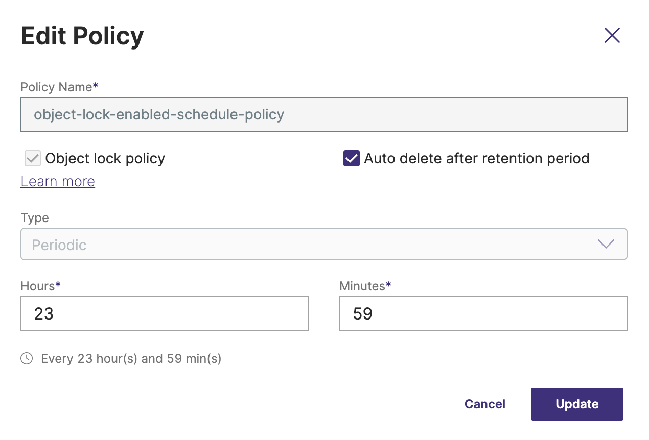 You can modify the following settings with update option for an object lock enabled schedule policy: